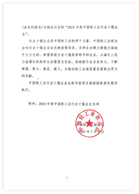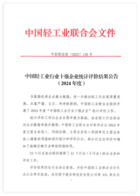 2025年7月9日,中國輕工業(yè)聯(lián)合會(huì )發(fā)布《中國輕工業(yè)行業(yè)十強企業(yè)統計評價(jià)結果公告》(中輕聯(lián)信統(2025)136號),發(fā)布了我國輕工業(yè)各行業(yè)的“2024年度中國輕工業(yè)行業(yè)十強企業(yè)”名單。